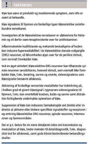 Kløe er et kardinalsymptom ved urticaria, scabies samt atopisk dermatitis og kan være et dominerende symptom ved flere dermatologiske sygdomme som f.eks. bulløs pemfigoid, kontaktdermatitis og psoriasis samt observeres i tilslutning til forbrændinger, neoplasier, brug af farmaka, nyresygdomme og kolestase. Konventionelt taler man om kronisk kløe ved en varighed på seks uger eller længere [1]. Kronisk kløe kan, afhængig af genese, oplevet intensitet og døgnvariation, udfordre nattesøvn, livskvalitet og arbejdsevne samt være associeret med angst, depression og suicidaltanker [1, 2].