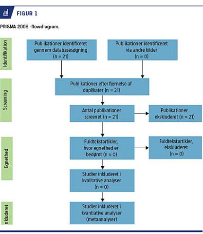 Den initiale søgning gav fund af 21 originalartikler, men ved gennemgang af abstrakterne blev der ikke fundet nogen observationelle eller randomiserede kontrollerede studier, hvor man sammenlignede kolecystektomi ved transskrotal eller transuretral adgang med konventionel laparoskopisk kolecystektomi (Figur 1) [9].