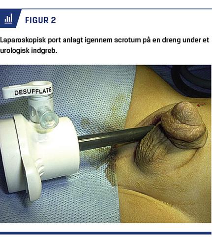 Dette studie var begrænset af den manglende forekomst af data, da ingen artikler opfyldte vores inklusionskriterier. Denne mangel på data kan skyldes manglende kvalificerede kirurgiske operationsinstrumenter og herved også manglende uddannelse og erfaring hos kirurger [1]. Der foreligger desværre heller ikke dyreeksperimentelle studier på området. Forskningsområdet kan således ikke anses for værende kønsløst, men er kønsdomineret, da det udelukkende inkluderer kvinder. Dette kan fremover udvikle sig til at blive et etisk dilemma. Samtidig er der et åbenbart paradoks, idet det tilsyneladende er en svær overrepræsentation af mandlige forskere, der gennemfører forskning i transvaginale indgreb. Således var otte ud af ti, seks ud af syv og fem ud af seks forskere af mandligt køn i forfattergrupperne i de tre seneste publicerede randomiserede studier [3, 15, 16]. Forklaringen på denne overrepræsentation er ikke indlysende, idet denne kønsdominering ikke ses på andre forskningsområder. Der kan være en forskel i raten af donationer til individuelle forskere baseret på køn [17], men denne er meget mindre end den dominans, der ses af mænd inden for dette forskningsfelt. Vi mener, at denne udvikling bør overvåges nøje, og der bør påbegyndes tiltag for at få en højere indsigt i mekanismerne bag den kønsvridning, som tilsyneladende finder sted inden for dette forskningsområde. For fremtiden er det vigtigt, at kirurger deltager aktivt i at udbedre denne kønsforskel. Ydermere kan man synes, at industrien også bør løfte et ansvar og udvikle sufficiente teknologiske værktøjer, således at både kvindelige og mandlige patienter kan bistås bedst muligt. Et eksempel på, hvordan en transskrotal kolecystektomiadgang kan se ud, kan findes i Figur 2 [18]. I øjeblikket foregår der en udvikling af et nyt såkaldt single port robot system (intuitive surgery), hvor man via et enkelt instrument kan arbejde med fire »arme« igennem en port [19]. Man kunne forestille sig, at dette instrument kunne anvendes i en transskrotal eller transuretral adgang hos mænd. Dette bør dog undersøges i fremtiden.
