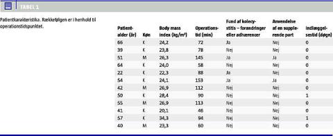 Resultater: Operationstiden var mediant 89 minutter. Fire patienter havde kolecystitisforandringer eller adhærencer. Hos to patienter var det nødvendigt at anvende en ekstra trokar. Der var ingen perioperative komplikationer. Ti patienter blev udskrevet samme dag og to den efterfølgende dag.