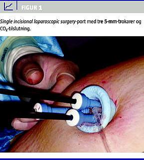 Til disse procedurer har industrien på det seneste udviklet portsystemer, der tillader flere instrumenter at passere samtidigt gennem en enkel bugvægsincision [9]. Samtidigt er der nu udviklet og markedsført instrumenter og endoskoper, der netop er udviklet til denne type kirurgi. Denne artikel beskriver de første erfaringer i en dansk afdeling med kolecystektomi foretaget ved anvendelse af SILS-teknik, idet der alene fokuseres på feasibility . Der indgik således ingen kontrolgruppe, hvorfor der eksempelvis ikke er registreret postoperative smerter eller kvalme.