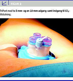 Alle indgreb blev udført i universel anæstesi af de samme to kirurger. Der anvendtes en åben 2 cm transversel adgang gennem bunden af umbilicus. Derefter blev portsystemet placeret, idet der enten anvendtes en SILS-port (Covidien, Mansfield, USA ( Figur 1 ) eller en TriPort (Olympus, Wicklow, Irland (Figur 2 ). Begge systemer tillader passage af op til tre trokarer, der indbyrdes kan bevæges i forhold til hinanden i det fleksible materiale. Insuflation med CO2 etableres gennem en separat kanal i systemet efter placeringen af trokarerne [10] (Figur 1). Der anvendtes et videolaparoskop med en stiv 30°-optik (5 eller 10 mm EndoEYE, Olympus, Hamborg, Tyskland (Figur 3 ) eller et fleksibelt skop (LTF-VP Deflectable Tip Vid eo Laparoscope , Olympus). En til to transkutane nylonsuturer blev herefter indført lige under costa 12 på højre side for at elevere galdeblæren og sikre optimal eksponering af Chalots trekant. Den efterfølgende dissektion blev udført med diatermi og en gribetang med variabel vinkling, der sikrede et lateralt træk på galdeblæren. Resten af operationen fulgte de konventionelle principper for laparoskopisk kolecystektomi med retrograd frilægning af galdeblæren.