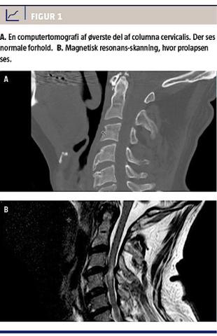 På femtedagen var der ingen fremgang. Neurologerne foreslog magnetisk resonans (MR)-skanning af columna totalis på mistanke om blødning/kontusion. Skanningen blev foretaget på tiendedagen, og den viste, at der var en traumatisk diskusprolaps på C3/C4, hvilket påvirkede medula spinalis (Figur 1).
