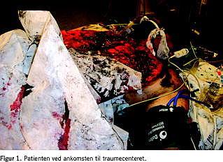 En 22-årig mand kom under arbejdet på et automobilværksted i klemme mellem en lastbil og en anhænger, således at krogen på anhængeren rev thoraxvæg og hud op fra sternum og ned til symfysen. Patienten sad herefter fastspændt.