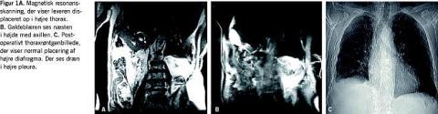 til observation på en intensivafdeling med henblik på kon-servativ behandling af et levertraume. Inden for det første døgn faldt hæmoglobinniveauet fra 8,6 mM til 7,4 mM. Der blev indlagt pleuradræn og udtømt 2 l blod. Derefter foretoges MR-skanning med MR-angiografi for nøjere at udrede traumet herunder at afklare forholdene omkring diafragma. MR-skanningen viste leveren liggende oppe i højre thorax (Figur 1A ) med galdeblæren næsten ud for axilniveau