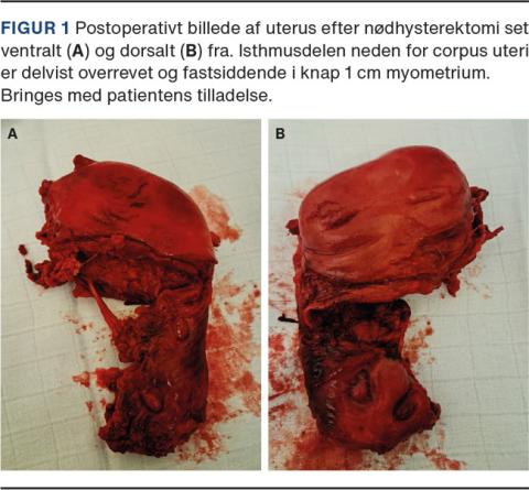 En 30-årig kvinde, sund og rask, para 0, gravida II, tidligere en spontan abort og aktuelt gravid med dikoriske diamniotiske gemelli i gestationsuge 15 + 6 dage, blev bragt ind via traumemodtagelsen efter involvering i en motorkøretøjskollision. Patienten havde været fastspændt medpassager, og airbags var blevet udløst. På ulykkesstedet blev der rejst mistanke om fri væske i abdomen, opstartet blodtransfusion og givet smertestillende behandling. Ved ankomst til lokalt sygehus var patienten hæmodynamisk stabil (blodtryk 110/99 mmHg, puls 130 slag/min), og hæmoglobinnivauet var 7,6 mmol/l. Objektivt var patienten vågen (Glasgow Coma Scale 14), smerteklagende og havde selelignende ekkymose ved nedre del af abdomen. Der blev foretaget FAST-UL-skanning ved gynækologisk/obstetrisk vagthavende med fund af anhydramnion, ét sikkert foster uden hjerteaktion i nedre del af abdomen samt stærk klinisk mistanke om uterusruptur. Supplerende traume-CT viste foruden multiple ortopædkirurgiske traumer tegn på uterusruptur, ekstrauterin lokalisation af ét af de to fostre og fri væske i abdomen beskrevet som blodtilblandet amnionvæske. Der blev foretaget akut eksplorativ laparotomi. Peroperativt fandtes hæmoperitoneum med 3.300 ml væske, to ekstrauterint beliggende fostre uden livstegn samt tydelig uterusruptur med pågående blødning fra a. uterina dextra. Der blev konstateret totalruptur af følgende højresidige strukturer: l. latum uteri, l. ovarii proprium, l. teres uteri og salpinx. Uterus sad fastholdt i knap 1 cm tilbageblivende myometrium og parametrium i venstre side (Figur 1A). Patienten blev lavtrykket peroperativt og fik inotropisk behandling, relevante transfusioner, uteruskontraherende medicin og antibiotika. Der blev foretaget supravaginal hysterektomi og dobbeltsidig salpingektomi. Patienten blev efterfølgende behandlet for sine ortopædkirurgiske problemstillinger og udskrevet 25 dage efter traumeepisoden.