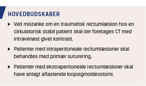 Det anbefales, at intraperitoneale rectumlæsioner sutureres, og hvis der er et stort substanstab, skal der foretages resektion med primær anastomose.