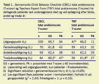 Af de 110 inkluderede børn blev fem ekskluderet på grund af manglende forældrerapporterede data ved udgangspunktet. Herefter udgjorde kohorten 105 børn (86 drenge og 19 piger, medianalder = 8,8 år). Antallet af respondenter på den årlige spørgeskemaudsendelse har varieret i opfølgningsperioden og var ved første, andet og tredje års opfølgning henholdsvis 70, 69 og 64. De gennemsnitlige CBCL total problemscorer (T-scorer) ved opfølgningerne er gengivet i Tabel 1 sammen med de tilsvarende lærerrapporterede TRF-total problemscorer (T-scorer). Tabellen viser samtidig procentandelen, der scores inden for normalområdet, defineret som mindre end eller lig med en standardafvigelse over gennemsnittet i baggrundspopulationen (T-score ≤60). Der blev fundet en signifikant reduktion i såvel forældrerapporteret som lærerrapporteret symptombelastning fra udgangspunktet til tre årsopfølgningen. Ved udgangspunktet var der kun TRF fra det ene deltagende center, udgørende 47 patienter eller 45% af kohorten. I forhold til baggrundspopulationen, hvor gennemsnits T-score er 50, afviger kohorten på alle opfølgningstidspunkter signifikant fra normen. Raten af børn, som scores inden for normalområdet af forældrene, stiger fra 34% ved udgangspunktet til 47% ved treårsopfølgningen (χ2 = 2,65; frihedsgrader (df) = 1; p = 0,10).