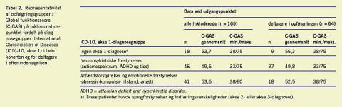 Kohorten fordelte sig på tre diagnostiske hovedgrupper: intet psykiatrisk syndrom (primært børn med specifikke og generelle indlæringsvanskeligheder), neuropsykiatriske forstyrrelser (opmærksomhedsforstyrrelser (attention deficit and hyperkinetic disorder (ADHD)), autismespektrumforstyrrelser og tics) samt adfærds- og emotionelle forstyrrelser (adfærdsforstyrrelser, tilknytningsforstyrrelser, tvangsforstyrrelser og angst), som det fremgår af Tabel 2. Tabellen viser de gennemsnitlige værdier af den globale psykosociale funktion (C-GAS) bedømt af det undersøgende team ved udgangspunktet, dels for hele kohorten (n = 105), dels i gruppen, som deltog i opfølgningen tre år senere (n = 64). Børnene uden nogen psykiatrisk diagnose, primært dårligt begavede børn og børn med specifikke indlæringsvanskeligheder, var mindst psykosocialt belastede, mens gruppen med neuropsykiatriske forstyrrelser var de dårligst fungerende. C-GAS-score er negativt korreleret til total problemscore (Pearsons korrelationskoefficient = -0,32; p < 0,001). Der findes ingen statistisk forskel på opfølgningsdeltagere (respondere) og hele kohorten, hvad angår diagnostisk fordeling, socialgruppefordeling, køns- eller aldersfordeling.