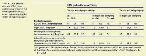 Gennemsnits CBCL total problem-T-scorer blev reduceret fra udgangspunktet (t0) til tredje årsopfølgningen (t3) i alle diagnostiske hovedgrupper (Tabel 3). Børn med adfærdsforstyrrelser og emotionelle forstyrrelser scoredes ved treårsopfølgningen lavest med gennemsnits CBCL total problem-T-score (t3) på 57,5. I alt 15 ud af 18 responderende (83%) i denne gruppe fik reduceret totalscore, og en større del normaliseredes i opfølgningsperioden (56% med T-score ≤60) i forhold til gruppen med neuropsykiatriske forstyrrelse. I sidstnævnte gruppe var gennemsnits CBCL total problem-T-score ved treårsopfølgningen (t3) = 62,1. Kun 25 af 37 eller 68% fik reduceret total problemscore, og andelen, der scoredes i normalområdet, var uændret fra udgangspunktet til opfølgningen. De samme tendenser blev genfundet ved lærerrating, hvor disse data var til rådighed. Ingen analyser vedrørende varians på tværs af de diagnostiske subgrupper (ANOVA) var signifikante på p < 0,05-niveau.