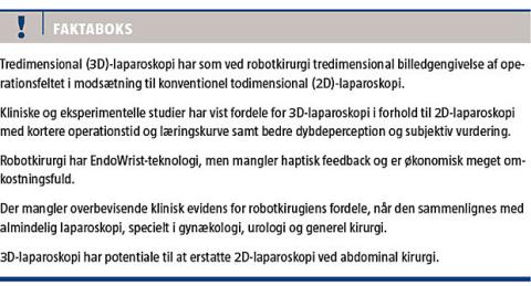 I ingen kliniske studier har man direkte sammenlignet 3D-laparoskopi med robotkirurgi. I et enkelt klinisk studie har man set på laparoskopiske operationer med anvendelse af en robotholdt 3D-kameraarm [17], og her fandt kirurgerne, at 3D-laparoskopi var behagelig, og at robotarmen gav god ergonomi.