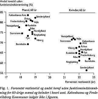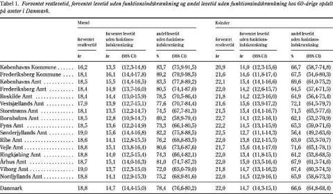 Resultater: I 2000 var den forventede restlevetid for 60-årige mænd og kvinder hhv. 18,8 år og 22,0 år og forventet levetid uden funktionsindskrænkning var 14,7 år for begge køn svarende til hhv. 78,4% og 66,6% af restlevetiden for mænd og kvinder. Forskelle i forventet levetid uden funktionsindskrænkning mellem amter var op til tre år. For kvinder sås en klar tendens til, at amter, hvor levetiden var længst, også var amter med den største andel leveår med funktionsindskrænkning, men for mænd var der ingen korrelation mellem forventet restlevetid og andelen heraf med funktionsindskrænkning.