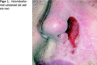 Summary Trigeminal trophic syndrome - a tough diagnostic nut to crack Ugeskr Læger 2009;171(6):437 Trigeminal trophic syndrome (TTS) is a rare but well-described syndrome consisting of the triad: paraesthesia, anaesthesia and crescent-shaped ulceration of the ala nasi. We report a case of a 62-year-old woman presenting with TTS after operative excision of an acusticus neurinoma. She attended several different specialized physicians and multiple biopsies were performed before attention was brought to the syndrome due to a history of trigeminal nerve damage combined with the aforementioned triad.