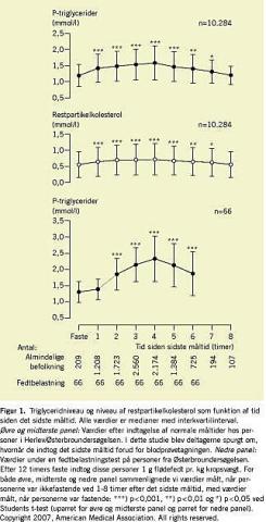 I et tværsnitsstudie af den almindelige danske befolkning, den såkaldte Herlev/Østerbroundersøgelse (the Copenhagen General Population Study) indsamlet på samme måde som Østerbroundersøgelsen (the Copenhagen City Heart Study), fandt vi, at plasmatriglyceriderne steg allerede en time efter indtagelse af almindelig mad og forblev forhøjede i op til syv timer efter det sidste måltid (Figur 1 ). De målte niveauer af triglycerider hos ikkefastende efter indtagelse af normal mad var en markør for øget niveau af kolesterol i restpartikler. Under en fedtbelastningstest var det højeste triglyceridniveau 2,3 mmol/l fire timer efter indtagelse af fedtet, hvorimod det højeste triglyceridniveau var 1,6 mmol/l fire timer efter indtagelse af normal mad hos den almindelige danske befolkning. Jo højere niveauet af triglycerider målt hos ikkefastende var, des højere var niveauet af restpartikelkolesterol [7].