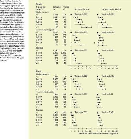 Alderskorrigerede hazard -ratioer for iskæmisk hjertesygdom var 1,7, 2,8, 3,0, 2,1 og 5,9 for kvinder og 1,3, 1,7, 2,1, 2,0 og 2,9 for mænd med stigende triglycerider versus < 1 mmol/l (Figur 2). Alderskorrigerede hazard -ratioer for død var 1,3, 1,7, 2,2, 2,2 og 4,3 for kvinder og 1,3, 1,4, 1,7, 1,8 og 2,0 for mænd med stigende triglycerider versus < 1 mmol/l.