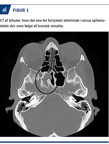 Der blev foretaget relevant biokemiske undersøgelser med normale fund. CT af hjernen og ansigtet og MR-skanning viste en anelse polyplignende slimhinde og fortykkelse af sinus sphenoethmoidalis på højre side (Figur 1). Der var ingen tegn på gennembrud til øjenhulen. Skanningerne viste, mod forventning, ingen patologisk opladning i parenkym, meninges eller kranienerver.