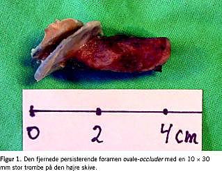 En 37-årig kvinde, der tidligere havde haft emboli i højre a. tibialis posterior påvist ved digital subtraktionsangiografi (DSA) og klinisk påvist emboli i venstre hånds fjerde finger, blev henvist til ekkokardiografi. Patienten var overvægtig (body mass index (BMI) 43 kg/m2 ), ryger og anvendte ikke peroral antikonception. Et elektrokardiogram viste normale forhold. Ved en transøsofageal ekkokardiografi (TEE) blev der påvist et PFO med en lille højre-venstre shunt, mens resten af hjertet var upåfaldende. Ved en omfattende screening for koagulationsforstyrrelser påvistes der ingen signifikante abnormiteter. På den baggrund antog man, at mekanismen var paradoks embolisering. I generel anæstesi og under TEE-vejledning blev der derfor via højre v. femoralis komplikationsfrit foretaget lukning af PFO med en 25 mm Amplatzer PFO-occluder . Der blev ved procedurens begyndelse givet en enkelt dosis heparin 10.000 IE intravenøst. En transtorakal ekkokardiografi (TTE) den følgende dag viste, at occluder' en var på plads uden tegn på residual shunt eller trombedannelse. Patienten blev udskrevet med magnyl 75 mg daglig. Ved en tremåneders kontrol rapporterede hun om hyppige tilfælde af kortvarig hjertebanken den seneste måned og et kort tilfælde med smerter og bleghed i venstre hånds fjerde finger en måned efter implantation af occluder' en. Ved TTE og TEE fandt man en 14 × 30 mm stor trombe direkte på occluder 'ens skive i højre atrium. Derudover fandt man en 6 mm stor trombe i lateralvæggen af venstre atrium uden kontakt til occluder' en. Patienten blev behandlet med peroral warfarin initialt sammen med ufraktioneret heparin givet intravenøst og senere med subkutant givet lavmolekylært heparin. Adskillige døgns telemetri viste vedvarende, stabil sinusrytme. Gentagen TEE viste kun en beskeden reduktion af trombemassen, og der blev derfor efter fire uger foretaget kirurgisk fjernelse af occluder 'en. Under proceduren blev der fundet en 10 × 30 mm stor bredbaset trombe centralt på occluder' ens højre skive med yderligere en få mm stor trombe på den forreste del af skiven. Occluder 'en med tromber blev fjernet in toto (Figur 1 ). Yderligere fire små tromber blev fjernet fra venstre atriums laterale væg, og foramen ovale blevet lukket med suturering. Patienten blev udskrevet med warfarinbehandling og ved en seksmånederskontrol viste en TEE ingen trombedannelse eller tegn på shunt. Patienten havde 24 måneder postoperativt ikke oplevet yderligere tromboemboliske episoder. Antikoagulansbehandlingen forventedes fortsat livslangt.