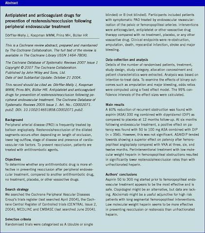 <li>Dorffler-Melly J, Koopman MM, Prins MH et al. Antiplatelet and anticoagulant drugs for prevention of restenosis/reocclusion following peripheral endovascular treatment. Cochrane Database Syst Rev 2005;(1):CD002071.</li>