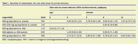 Den fundne effekt på reokklusion er højere end forventet, idet acetylsalicylsyre i større metaanalyser med kardiovaskulære hændelser som endepunkt hos patienter med perifer arteriel sygdom kun har vist en relativ risikoreduktion på 25% sammenlignet med placebo [3]. Årsagen til denne diskrepans er formentlig, at studierne i denne metaanalyse alle er relativt små, hvorfor sikkerhedsintervallet for den påviste effekt er stor og derfor må tolkes med forbehold.