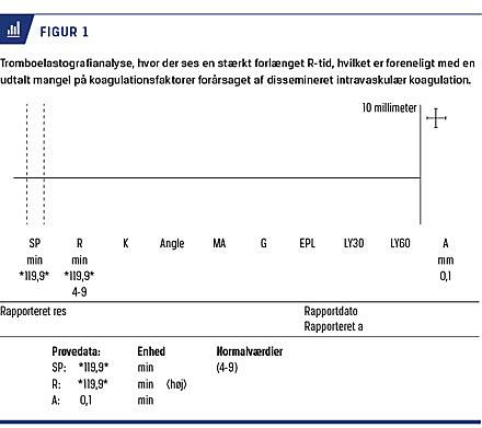 En 38-årig para 3 med normal graviditet og tidligere ukomplicerede fødsler fik induceret fødselen i uge 41 + 2. Efter få timer opstod der vedvarende bradykardi målt med kardiotokografi, og hun klagede over dyspnø. Umiddelbart herefter blev hun ukontaktbar. Hun fik ilttilskud på maske og blev lejret i venstre sideleje. Da tilstanden ikke bedredes, blev der ordineret akut sectio i generel anæstesi. Efter ni minutter forløstes et svært asfyktisk barn. Patienten stabiliseredes herefter respiratorisk, men blev tiltagende hypotensiv med behov for væske- og pressorbehandling, og der opstod uterin atoni og livstruende blødning uden respons på uterotonika. Der blev anlagt bakriballon og B-lynch-sutur samt igangsat balanceret blodkomponentterapi med erytrocytter (SAGM-suspension), plasma og trombocytkoncentrat (TK). Blødningen fortsatte uden koageldannelse. Tromboelastografi (TEG) viste initialt svært forlænget R-tid (Figur 1), hvilket er forenligt med lav koncentration af koagulationsfaktorer. Videre transfusion blev vejledt af en transfusionsmedicinsk speciallæge på baggrund TEG-måling. Til trods for normalisering af TEG-resultaterne efter transfusion og admini-