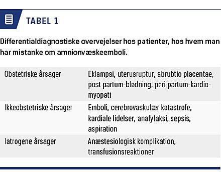 Amnionvæskeemboli (AVE) er en alvorlig obstetrisk komplikation med høj maternel og føtal mortalitet. Til trods for at tilstanden er sjælden med en incidens på 1-6:100.000, er den en af de hyppigste dødsårsager hos gravide [1, 2]. Selv med optimal behandling er AVE forbundet med risiko for neurologiske sequelae og en maternel mortalitet på 20-60% [1, 2]. AVE kan hverken forudsiges eller forebygges, ligesom diagnosen ikke underbygges af histologiske eller biokemiske markører [1]. (Tabel 1).