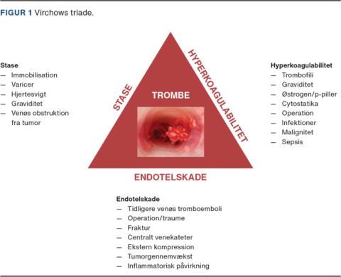 Trombofili præsenteres første gang i 1856 af Virchow, som anførte ændringer i koagulationen som en af de mekanismer, der bidrager til dannelse af VTE (Figur 1) [2]. Ud over trombofili er der en række patientrelaterede risikofaktorer for VTE, herunder stigende alder, højt body mass index, rygning, medicinsk komorbiditet og familiær disposition.