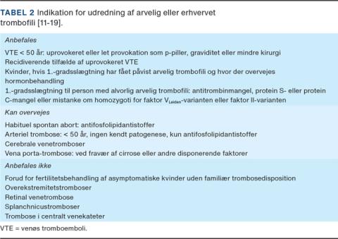 Tabel 2 viser, hvornår der er indikation for trombofiliudredning. Udredning anbefales ikke til uselekterede patienter med trombose. Det anbefales således kun til patienter under 50 år, hvor den venøse trombose er uprovokeret eller med mindre udløsende risikofaktor (f.eks. p-piller, mindre kirurgi eller rejse > 6 timer). Udredning for arvelig trombofili hos patienter med provokeret førstegangs-VTE er således ikke indiceret. Dog er der indikation for undersøgelse for APA hos patienter med uprovokeret VTE og kronisk inflammatorisk grundsygdom, uanset alder, medmindre grundsygdommen er i remission.