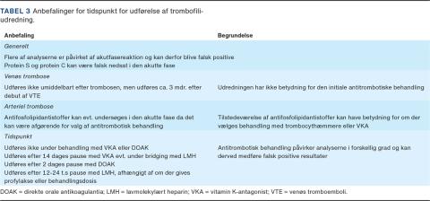 Det er mest hensigtsmæssigt at udføre trombofiliudredning, når patienten er i sin habitualtilstand, dvs. 2-4 uger efter ophør af antikoagulans (AK)-behandling (Tabel 3). Dette skyldes, at både den akutte fase efter trombosen og selve AK-behandlingen påvirker analyserne og kan medføre falsk positive resultater. Endvidere vil tilstedeværelse af trombofili sjældent påvirke den akutte behandling, medmindre patienten har APS. Fordelen ved at vente med udredningen er, at man har et fuldstændigt behandlingsforløb at træffe den videre beslutning om AK-behandling på. Ulempen er den langsommelige proces, hvilket kan komplicere det samlede udredningsforløb.