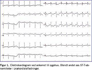 I det medicinske modtageafsnit klagede hun over åndenød og et hævet venstre ben. Objektivt fandtes en hjertefrekvens på 117 slag/minut, blodtryk på 129/93 mmHg, temperatur på 37,6 C og transkutan iltsaturation på 87% uden ilttilskud. Klinisk var der ingen tegn på cirkulationssvigt eller cor pulmonale. Hjerte- og lungestetoskopi var uden abnorme fund fraset takykardi og takypnø. Venstre ben var hævet og ømt langs karskeden. Elektrokardiogram (EKG) ses i Figur 1. Arteriegasanalyse efter påbegyndt iltbehandling viste respiratorisk alkalose uden hypoksæmi. På mistanke om dyb venetrombose og lungeemboli blev der givet dalteparin 18.000 internationale enheder (IE) subkutant og rekvireret subakut spiral computertomografi (CT) af thorax.