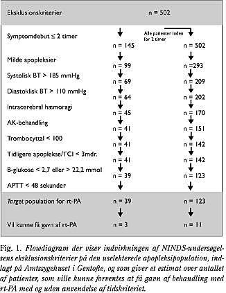 Figuren illustrerer også den tænkte situation, at alle 502 patienter ankom inden for to timer. I den situation er det apopleksiens sværhedsgrad og blodtrykket, der er de væsentligste årsager til eksklusion. Kom alle patienter inden for to timer, ville 123 patienter (25%) være kommet i betragtning (target- population). Gennemsnitsalderen for disse patienter var 76 år; 28 patienter (23% af target- populationen) var 85 år eller derover. Kun 11 patienter (2,2%) ville kunne forventes at profitere af behandlingen beregnet som 0,27× 123× 0,32 =11 (95% CI 1-23) eller 2,2% (95% CI 0,2%-4,6%).