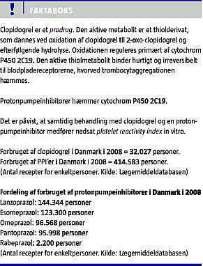 Samtidig behandling med PPI nedsætter effekten af CLO in vitro og muligvis tillige in vivo. Imidlertid foreligger der ikke tilstrækkelig evidens fra klinisk randomiserede studier til, at man kan påvise en øget risiko for stenttrombose ved kombinationsbehandling med CLO og PPI efter PCI. Kun med et større prospektivt gennemført, randomiseret og placebokontrolleret forsøg, der er dobbeltblindet, vil man endeligt kunne af- eller bekræfte mistanken om en negativ PPI-effekt og dermed vise, hvorvidt der er forskel i forekomsten af stenttrombose ved de forskellige kombinationsbehandlinger med CLO og en PPI.