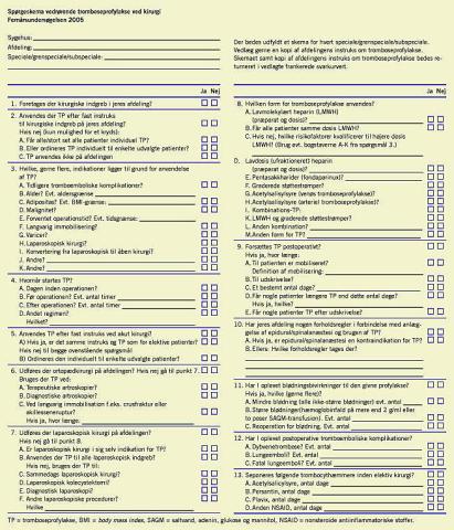 Formålet med dette arbejde har været at afdække holdningen til og anvendelsen af tromboseprofylakse (TP) i 2005 på danske kirurgiske afdelingers og at relatere dette til tidligere gennemførte spørgeskemaundersøgelser.