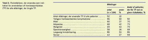 I Tabel 2 vises de mest almindelige indikationer for brugen af TP. En del afdelinger (n = 52) oplyste, at de gav TP til alle patienter eller til alle patienter over 18/20 år. Disse er medregnet i den totale procent i højre kolonne. Den hyppigste risikofaktor, der udløste TP, var tidligere TE-komplikationer, 92%, næsthyppigst var langvarig immobilisering 86%. Hvis alder blev vurderet som risikofaktor, var dette som oftest ved alder over 40 år. Ved vægt som indikation for TP var grænsen for body mass index enten 30 eller 35. Operationsvarigheden var hyppigst over 30 eller 60 minutter for at udløse TP-behandling.
