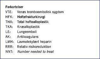 Tromboseprofylakse med lavmolekylært heparin (LMH) i 7-10 dage efter THA, TKA og HFK har været anvendt rutinemæssigt på de fleste ortopædkirurgiske afdelinger siden slutningen af 1980'erne. I 1990'erne erkendte man, at en del patienter trods tromboseprofylakse fik symptomgivende VTE i ugerne efter operationen. Dette førte til en række studier, hvori man sammenlignede effekten af traditionel, kortvarig profylakse med 4-5 ugers profylakse. En metaanalyse af disse studier viser, at symptomgivende VTE forekommer hos 1,4% efter langtidprofylakse og hos 4,2% efter kortvarig profylakse (relativ risiko 0,36; 95% konfidensinterval 0,02-0,67; p < 0,001) [6]. Selv om det er vist, at langtidsprofylakse reducerer risikoen for postoperativ VTE, anvendes langtidsprofylakse kun sjældent, formentlig fordi mange finder det problematisk at udskrive patienter til hjemmebehandling med et injektionspræparat.