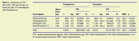 Kirurgi er den vigtigste risikofaktor for udvikling af venøs tromboembolisk sygdom (VTE). Cirka en tredjedel af alle tilfælde af VTE ses efter kirurgiske indgreb [1, 2]. Risikoen er særlig høj efter hoftefrakturkirurgi (HFK) og total hofte- og knæalloplastik (THA og TKA), og da disse operationer samtidig er ganske hyppige, er det ved at blive en tradition, at man begynder med disse patientgrupper, når den tromboseprofylaktiske effekt af nye antikoagulantia skal undersøges. Det har også været tilfældet med det nyligt markedsførte pentasakkarid fondaparinux og trombinhæmmeren melagatran, som markedsføres senere i år.