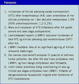 Incidensen af VTE efter KA er lavere end efter knæalloplastik eller større hoftenær kirurgi. Risikoen for VTE stiger bl.a. med anvendelse af tourniquet, længerevarende terapi og høj patiententalder. Da de angivne VTE-incidenser i litteraturen har været varierende, har der hidtil hersket tvivl om indikationen for mekanisk eller medicinsk profylakse mod VTE til disse patienter. Vores revision af Cochranearbejdet viser, at anvendelse af LMWH statistisk signifikant reducerer dels alle DVT-tilfælde, men også de symptomatiske VTE-tilfælde isoleret set. Profylakse med LMWH øger ikke signifikant incidensen af blødningskomplikationer, der for størstedelen udgøres af episoder, der ikke er klinisk relevante. Da gennemsnitligt 78 KA-patienter skal have profylakse med LMWH for at undgå ét klinisk tilfælde af VTE, kan profylaksen på det foreliggende grundlag ikke umiddelbart anbefales til alle patienter, der gennemgår KA, før der bl.a. foreligger cost-benefit-analyser til støtte heraf. Profylakse med LMWH bør dog tilbydes i tilfælde af længerevarende terapi eller ved tilstedeværelse af kendte risikofaktorer for VTE hos patienten. Varigheden af profylaksen bør i de tilfælde være mindst syv døgn fra operationstidspunktet.