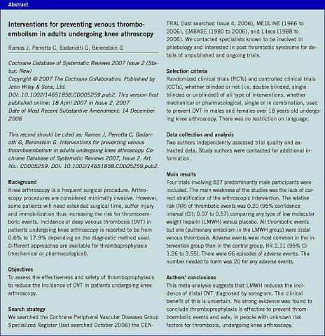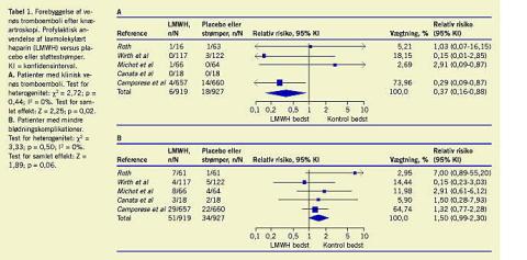 Cochranearbejdet dokumenterer en signifikant reduktion af asymsptomatiske DVT-tilfælde efter profylakse med LMWH, hvorimod det ikke viser en signifikant forskel mellem forekomsterne af de mere klinisk relevante symptomatiske trombeembolier i interventions- og kontrolgruppen.