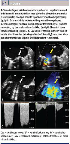 Sygdomsforløbet, som førte til indlæggelsen, debuterede med åndenød, tør hoste og rallende vejrtrækning, der forværredes i liggende stilling, samt respirationssynkrone retrosternale smerter. Der var ikke beskrevet mislyde. Patienten henvendte sig på sit lokalsygehus to gange. Her fandtes han afebril med normale infektionstal, dog gav stetoskopi mistanke om pneumoni, og et røntgenbillede af thorax blev tolket som visende et diffust højresidigt underlapsinfiltrat. Patienten blev sendt hjem med penicillin. På fjerdedagen henvendte han sig igen. Han var da akut påvirket, dyspnøisk og klamtsvedende. Blodtrykket blev målt til 101/58 mmHg, pulsen til 102 slag pr. minut, SaO2 var 99% på 10 l O2 og laktatniveauet var 7,8 mmol/l. Røntgenbilledet af thorax viste nu pleuraekssudat, atelektase og lungestase. En transtorakal ekkokardiografi viste en velfungerende venstre ventrikel med en lille kavitet samt høj middelgradient på 26 mmHg over mitralklappen. Der opstod mistanke om akut trombosering af mitralklappen, og der blev givet 10.000 IE heparin i.v., hvorpå patienten blev overflyttet til en intensivafdeling på et hjertecenter. Han var sederet og intuberet, og der blev påbegyndt noradrenalinbehandling pga. et nu lavt blodtryk på 83/49 mmHg og et forhøjet laktatniveau. Der blev foretaget en akut transøsofageal ekkokardiografi, hvorved det blev bekræftet, at der var en tromboseret mitralklap med en immobil vippeskive og en med begrænset bevægelighed (Figur 1). Tromben vurderedes at have en udstrækning på under 1 cm2, og middelgradient over klappen var 25 mmHg. På grund af risiko for embolier ved trombolyse [3] og kardiogent shock overvejedes akut kirurgi, som dog fandtes for risikabel pga. patientens samlede komorbiditet. Herefter blev der iværksat trombolysebehandling på vital indikation trods embolirisiko. Patientens shocktilstand bedredes hurtigt. På en transøsofageal ekkokardiografi næste morgen fandt man, at tromben var opløst, og der var normaliseret klapfunktion med middelgradient over klappen på 3 mmHg. Han blev flyttet til et lokalhospital i habitualtilstand to dage
