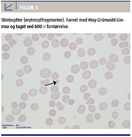 bilirubin 49 mikromol/l (normalværdi: 5-25 mikromol/l) og normale nyretal. Videre udredning viste negativ Coombs test og perifert udstryg med 2-4% skistocytter (Figur 1). Ved en UL-skanning af abdomen fandt man let splenomegali og ellers normale forhold. En røntgenoptagelse af thorax viste normale forhold. Afføringsprøver viste vækst af