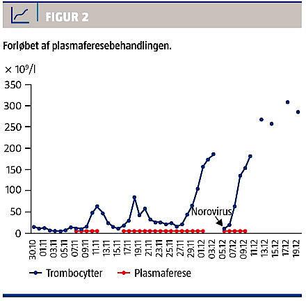 knoglemarvsundersøgelse på syvendedagen viste øget erytropoiese og mange megakaryocytter. ADAMTS13-test blev taget på den første indlæggelsesdag, og endeligt svar, der fremkom på dag 7, viste et lavt ADAMTS-proteinniveau på < 0,04 arb.enh/l (normalværdi: 0,75-1,33 arb.enh/l) og positivt testresultat for autoantistoffer. Pga. af skistocytterne havde man mistanke om diagnosen TTP fra den første dag. Da der var fravær af nyresymptomer og neurologiske symptomer, forsøgte man uden sufficient effekt initial behandling med frisk frosset plasma i fem dage. Derfor blev der på den sjette indlæggelsesdag påbegyndt plasmaferese, initialt i fem døgn, og trc-niveauet steg til 63 × 109/l (Figur 2). Efter fire dages pause faldt trc-niveauet til 14 × 109/l, og plasmaferesen blev genoptaget og suppleret med prednisolon. Denne gang gav man plasmaferese i 17 dage. To uger efter første plasmaferese påbegyndte man pga. kun partiel respons behandling med rituximab 375 mg/m2× 1 ugentligt i fire uger. Trc-niveauet steg på denne behandling til 185 × 109/l. Desværre fik patienten recidiv efter to døgns pause fra plasmaferesen pga. norovirusinfektion. Der blev atter givet plasmaferese i fem dage, og trc-niveauet steg fra 10 til 153 × 109/l. Prednisolon blev udtrappet over en måned.