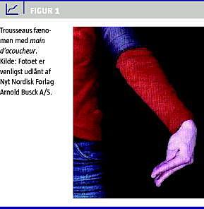 Tetani med karpopedalspasmer som f.eks. Trousseaus fænomen med main d'acoucheur (fødselshjælperhånd) er et klinisk tegn på øget neuromuskulær irritabilitet: Håndleddene flekteres, fingrene samles i en pyramide, idet tommelen adduceres, og de øvrige fingre flekteres i grundleddene og ekstenderes i interfalangealleddene, se Figur 1 [1]. Vi rapporterer om tre tilfælde af hypokalcæmi-induceret Trousseaus fænomen med main d'acoucheur grundet hyperventilation med få ugers mellemrum i Kolding Skadestue. Patienterne forlod alle skadestuen i velbefindende efter beroligelse og forklaring af mekanismen bag tetani og hyperventilation.