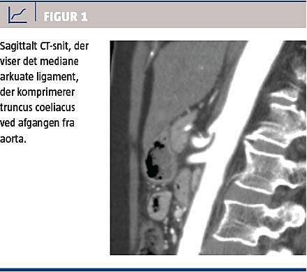 Patienten blev henvist til diagnostisk laparoskopi, som viste minimale adhærenser ved leveren. Under indlæggelse efter laparoskopien havde hun morfikakrævende smerter, og ved en efterfølgende CT-angiografi påviste man en variant af det mediane arkuate ligament, hvilket medførte type C-stenose ved afgangen af truncus coeliacus (Figur 1). Fundet blev konfereret med Karkirurgisk Afdeling på Rigshospitalet, hvor man bekræftede diagnosen.