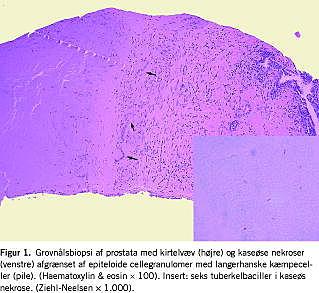 Prostata var uøm, lille, fast og uregelmæssig. Prostataspecifikt antigen (PSA) var 4,5 μg/l, sedimentationsreaktion (SR) 69 mm og C-reaktivt protein (CRP) 51 mg/l med normalt leukocyttal. På en transrektal ultralydskanning sås et hypodenst område. Grovnålsbiopsier af prostata viste granulomatøs inflammation med kaseøse nekroser og i Ziehl-Neelsen-farvning sås syre-alkohol-faste stave (Figur 1 ). En efterfølgende computertomografi (CT)-urografi viste normale forhold uden renal patologi. Mantouxtest var 2,5 cm (patienten var Calmette-vaccineret). Røntgen af thorax viste talrige smånodulære fortætninger bilateralt. I urin og ekspektorat fandt man ved direkte mikroskopi syre-alkohol-faste stave, og ved dyrkning fandt man kolonier af M. tuberculosis. Polymerasekædereaktion (PCR) for M. tuberculosis complex var positiv. Patienten hostede en del og var alment påvirket. Der blev påbegyndt firestofantituberkuløs behandling.