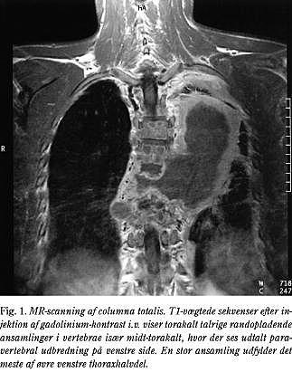 Objektivt fandtes en dekstrokonveks skoliose og en udtalt kyfosedannelse midt-torakalt. Patienten beskrev hypæstesi lateralt på venstre femur, crus og laterale fodrand. Paraklinisk: SR 34, CRP 24, basisk fosfatase 503 (80-275 U/l) og let nedsat hæmoglobin 6,9. Hiv-test var negativ, og der fandtes en positiv Mantoux på 20 mm. Patienten angav intet alkoholmisbrug. Røntgen af thorax viste forstørrede mediastinale lymfeglandler og paraspinal bløddelshævelse, men ingen lungeinfiltrater.