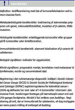 Selv om budding /fokal dedifferentiering blev beskrevet for mere end 20 år siden, er det først i de senere år, at fænomenet har været genstand for en betydelig opmærksomhed. I 2006 indførtes registrering af budding i DCCG/DSPAC's registreringsskema for KRK. Buddings molekylære baggrund er delvis belyst med formodet korrelation til den traditionelle adenom-karcinom-signalvej, der bl. a. involverer APC-mutation, samt til KRAS-mutation. Fænomenets potentiale som prognostisk markør synes veletableret, omend konsensus omkring den mest optimale registreringsmetode endnu ikke er opnået. Det kan anbefales at bibeholde den allerede omtalte registreringsmetode i DCCGs/DSPACs skema, men vurdering på snit, der er immunfarvede for et cytokeratin, må foretrækkes. Oplysning om tumors budding-fænotype medinddrages dog endnu ikke ved beslutninger angående håndtering af patienter med KRK. Belysning af værdien af budding -status som rettesnor for patientbehandling vil kræve yderligere gerne internationale prospektive studier [32].
