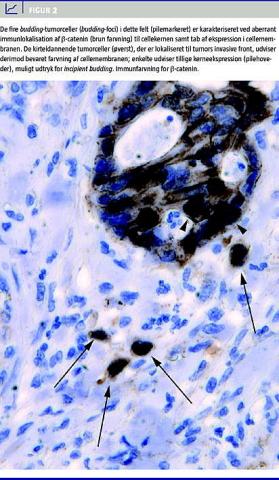 Ved budding ses således tab af kohæsion mellem tumorceller, elektronmikroskopisk visualiseret ved tab af junction-komplekser og udvikling af ukomplette desmosomer samt manglende eller rudimentær basalmembran. Processen formodes at forudsætte ændringer af molekyler af betydning for celleadhæsionen, inklusive epithelial cell adhesion molecule (Ep-CAM/E-cadherin) og β-catenin [16, 17]. Disse proteiner, der normalt er cellemembranbundne, translokeres til tumorcellens cytoplasma og kerne. I denne abnorme position i tumorcellens kerne aktiveres β-catenintranskriptionen af gener, der er involveret i proliferation og differentiering. Ud over betydning for celleadhæsion kan β-catenin således antage funktion som et onkogen. Akkumulation af β-catenin i tumorcellens kerne vil under normale forhold hindres af suppressor-genet adenomatøs polyposis coli (APC), der binder og degraderer proteinet. Inaktivering af APC, eksemplificeret ved den traditionelle dysregulering af APC/β-catenin-signalvej, der er en hyppig og tidlig, omend ikke obligat genetisk hændelse i den kolorektale karcinogenese, kan derimod resultere i den beskrevne aberrante lokalisation af proteinet (Figur 2 ). Mutation af β-catenin er en anden årsag til translokation af proteinet, der kan medføre budding . Dette ses i nogle tilfælde af karcinom, der er udviklet hos patienter med hereditær nonpolypose-coloncancer (HNPCC)-syndrom [18]. Ved HNPC C-associeret karcinom er budding rapporteret hos ca. 20% [19]. Budding -analyse af familiær adenomatøs polypose (FAP)-associeret kolorektalt karcinom foreligger - os bekendt - endnu ikke, men i betragtning af dette karcinoms molekylære baggrund, der oftest involverer APC/β-catenin-dysregulering, kunne det forventes, at budding generelt vil være høj ved denne cancerform. Desuden er det forventeligt, at de KRK, der ikke følger den traditionelle adenom-karcinom-patogenese, som f.eks. det serrate KRK [20], der er udviklet fra den sessile serrate polyp [21], ikke eller i kun ringe omfang danner budding .