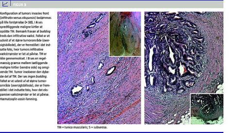 Vurdering af det kolorektale karcinoms (KRK) biologiske potentiale baseres primært på status af de regionale lymfeknuder, som er en vigtig prognostisk markør [1]. Imidlertid vil en del af de kurativt opererede patienter, der findes uden metastaser til lymfeknuder, senere udvikle recidiv, som medfører død. Det er derfor relevant at registrere yderligere prognostiske parametre. Oplysning om en tumors aggressivitet kan tillige opnås ved at registrere dens morfologi, inklusive dens differentieringsgrad og relation til kar og nerver [2, 3]. Specielt må forhold i relation til tumors invasive front forventes at have klinisk betydning. Det drejer sig dels om den invasive fronts lokalisation i forhold til tarmvæggens lag, angivet som pT1-4-stadie, dels om specielle morfologiske forhold ved grænsen mellem tumor og det omgivende væv [4-6], der repræsenterer første trin i den metastatiske kaskade. Således har tumors vækstmønster eller konfiguration ved den invasive front, infiltrativ eller ekspansiv/pushing af type, været foreslået som prognostisk markør. Den infiltrativt voksende tumor har således ifølge nogle studier [5] vist et mere aggressivt forløb end tumorer med en ekspansiv vækst. I andre studier har man imidlertid konkluderet, at denne parameter ikke bidrager med prognostisk information, der er uafhængig af tumor-node -stadiet [7, 8] og tillige kan være vanskelig at reproducere [7, 9]. Det samme gælder det peritumorale lymfocytiske infiltrat [9]. Disse parametre er således generelt ikke blevet inkluderet i den rutinemæssige karakteristik af KRK og indgår således heller ikke i Danish Colorectal Cancer Groups (DCCG) & Danish Society of Pathology and Cytologys (DSPAC) registreringsskema for kolorektal cancer.