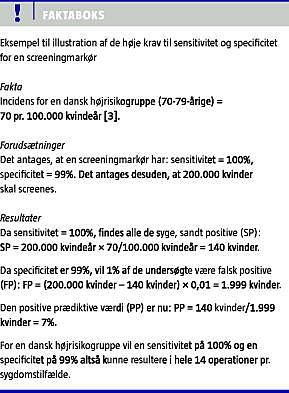 Der er store krav til en screeningmarkørs validitet, og det er afgørende, at der opnås en høj sensitivitet (sens.) og specificitet (spec.). Behovet for en høj spec. er særlig vigtigt, idet kirurgisk behandling ofte vil være nødvendigt ved fund af udfyldning i bækkenet. Rosenthal et al har beregnet den lavest accepterede spec. til ca. 99,6% for almenbefolkningen, hvilket svarer til en positiv prædiktiv værdi (PP) på 10% (ti operationer/cancer) [8]. En lavere spec. ville kunne accepteres ved screening af højrisikopatienter (arveligt disponerede), idet prævalensen i denne gruppe er højere [8].