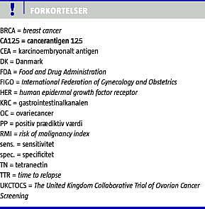 Behandlingen af ovariecancer (OC) har de seneste par år været under stor politisk og offentlig bevågenhed. Et gennemgående tema har været centralisering til få gynækologisk-onkologiske centre, der behersker ekstensiv kirurgi [1]. Regeringen og regionerne indgik i oktober 2007 en aftale om akut behandling af forskellige cancerpatientgrupper. Der iværksættes pakkeforløb, der - hvad angår OC - skal implementeres senest medio 2008. OC-pakken omfatter hele udredningsapparatet fra egen læge til specialiseret kirurgisk behandling, hvor tumormarkører (CA125) indgår som et af de væsentligste diagnostiske redskaber. Dette understreger behovet for yderligere oplysning om OC og tumormarkører.