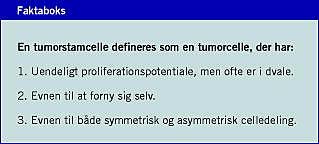 En tumorstamcelle defineres som en tumorcelle, der 1) har et uendeligt proliferationspotentiale, 2) er i stand til at forny sig selv og 3) samtidig kan give ophav til mere differentierede tumorceller (Figur 1 ). Kapaciteten til både at danne kopier af sig selv og danne mere differentierede celler beror på evnen til hhv. symmetrisk og asymmetrisk celledeling. Ud over de her nævnte egenskaber, som er fælles for normale stamceller og tumorstamceller, har begge celletyper øget aktivering af antiapoptosekaskader og øget membrantransportaktivitet. Desuden er begge celletyper i stand til at migrere. Tumorstamceller giver anledning til tumordannelse, hvorimod normale stamceller fungerer som et reparationssystem i kroppen ved at opretholde det nødvendige antal specialiserede celler.